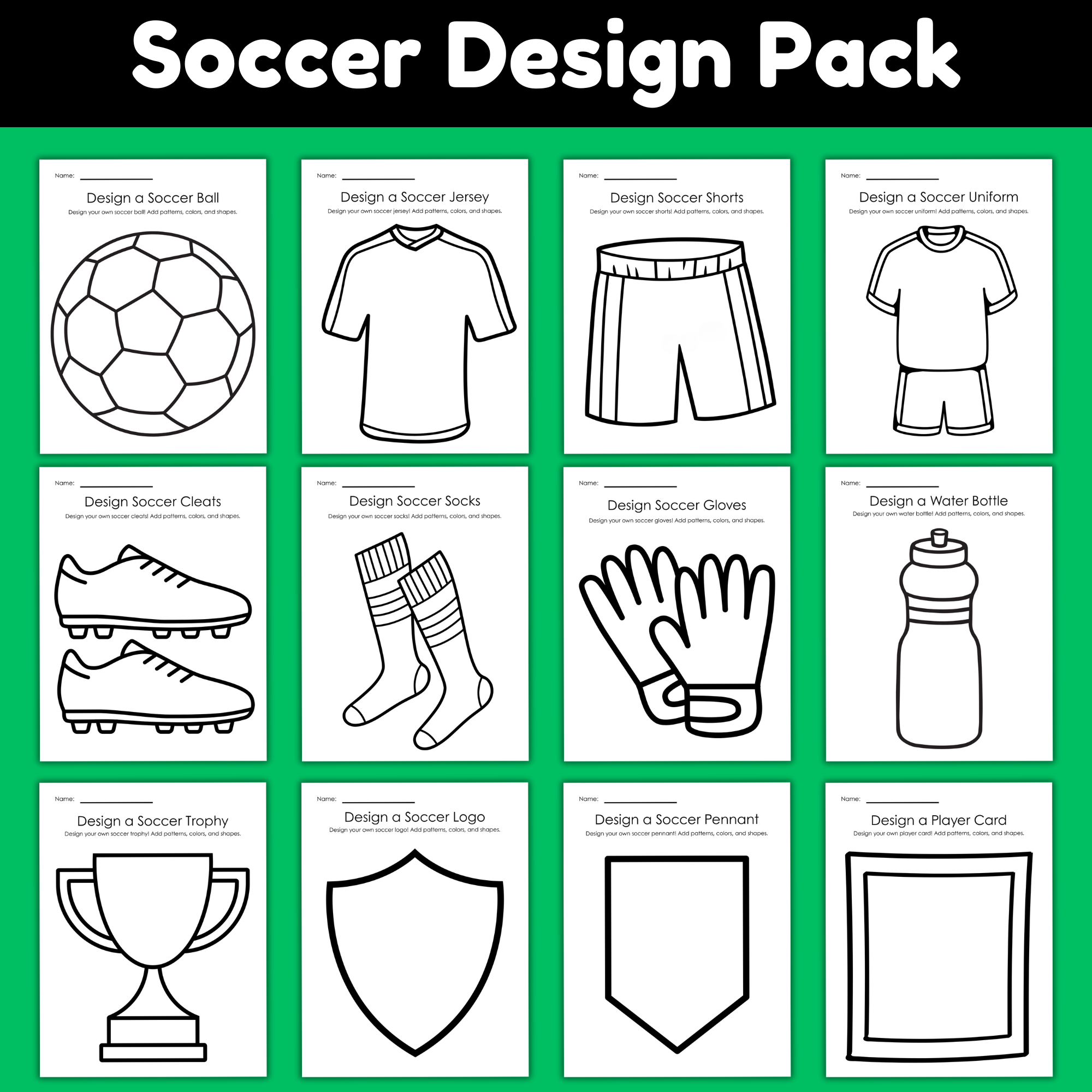 This pack includes 12 fun, kid-friendly pages that let kids get creative with everything soccer-related: