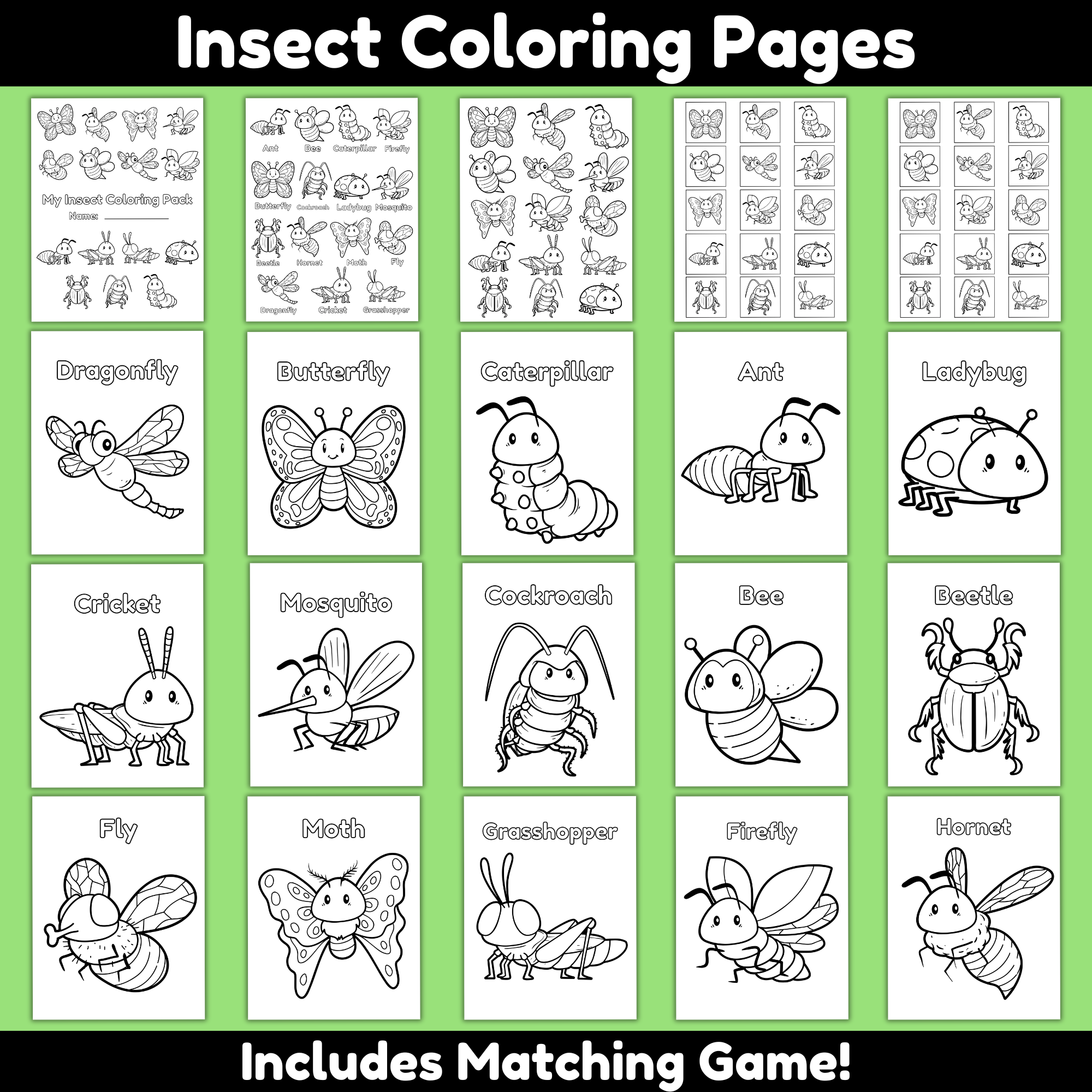 - Cover Page: “My Insect Coloring Pack” with space for your child’s name